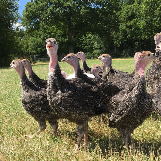 Our turkeys are now very adventurous, roaming further around our grassy paddocks and meadows. Our turkeys are free to roam the farm throughout daylight with access to food and clean water and return to the warmth of our barns every evening, safe away from the elements. The turkeys are now reaching full maturity, and as you can see, their distinctive features are now more recognisable and allow us to establish between a stag and hen turkey. As we are a family farm, our little farmers love to help let our turkeys out and enjoy the turkeys following us when walking our dogs.